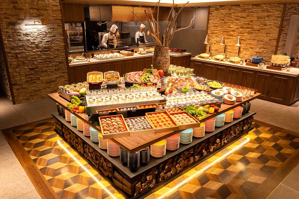 伝統とモダンが調和したレストランでは、箱根エリア周辺の食材を最大限に活かし、山と海の幸を味わう創作料理をお楽しみいただけます。夕食時は箱根の銘柄豚である箱根山麗豚と白葱の緑茶蒸しや、神奈川名物サンマーメンをご用意。朝食にはライブキッチンでご提供する切りたて鎌倉ハムに、相模の赤玉子のオムレツ、小田原おでんなど、夕朝食ともにご当地グルメもお楽しみいただけます。また「オールインクルーシブ」を採用しているので、夕食時のアルコールはすべて飲み放題です。
