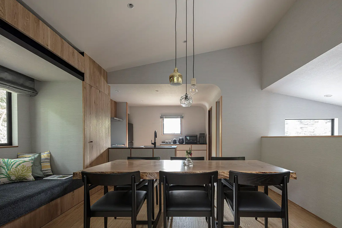すべての寝室には外に開かれた専用テラスを設置し、他室から視線が交わらないプライバシー設計を採用。2階にはダイニングとリビングをつなぐアウトドアリビングを備え、複数の家族やグループでの滞在に最適です。