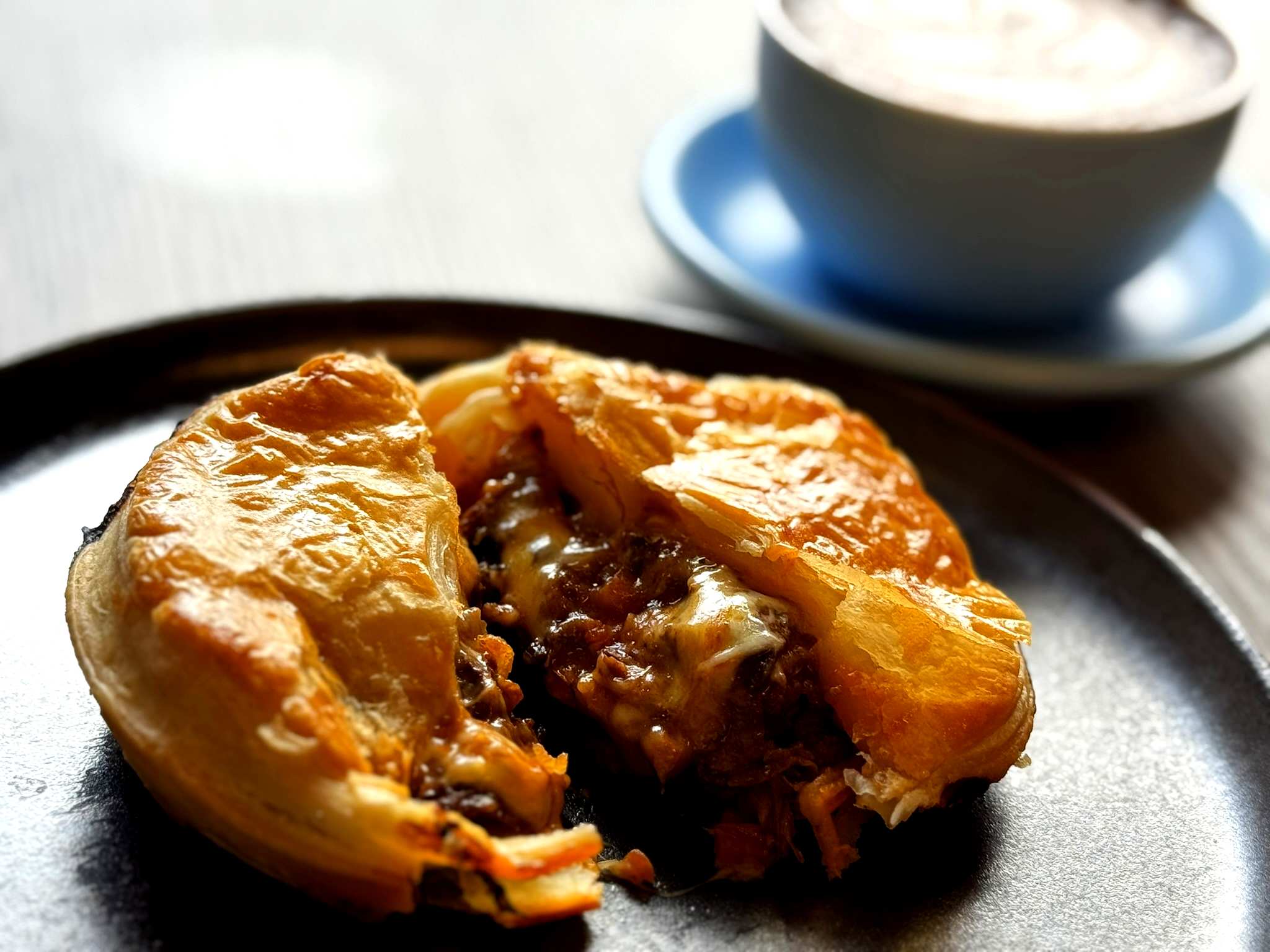 そして、名物ともいえる逸品が、オーナー奥様の手仕込みの「自家製ニュージーランドミートパイ」。具材は国産和牛スネ肉や野菜を約4時間煮込み、生地は土台の生地と上に被せる生地をそれぞれ配合を変えて作るこだわり!仕込みから焼き上がりまで丸2日間かけて作るミートパイは焼きたての香りは幸せそのもの。発酵バターの入った生地はサクサクで、ナイフを入れると柔らかいお肉がゴロゴロ出てきてチーズがとろりで絶品!数量限定なので午前中に売り切れることも。