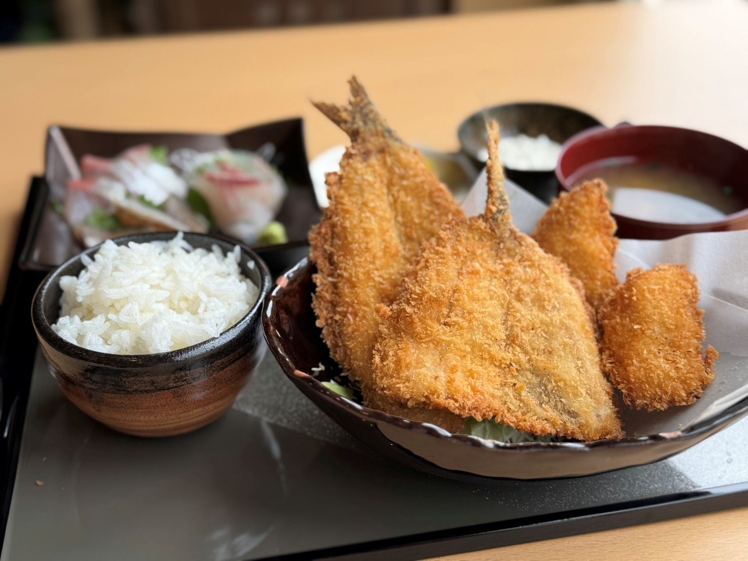 もう一つの人気メニューは、フライ定食。大ぶりなアジフライに、カマスフライなどに加えてお刺身も楽しめるお得な定食。自家製タルタルソースでいただくフライは絶品です。