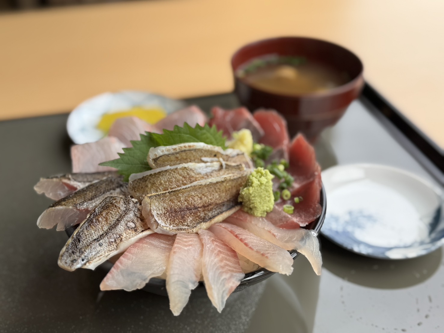 おすすめは、地魚海鮮丼。朝獲れの新鮮な地魚を豪快に盛り付けた贅沢な丼。この日は、シロダイ・ソウダガツオ・炙りカマス・カンパチがご飯が見えないくらいに敷き詰められ、ボリュームも大満足。
