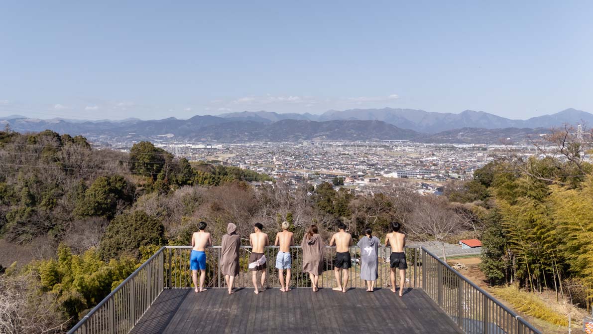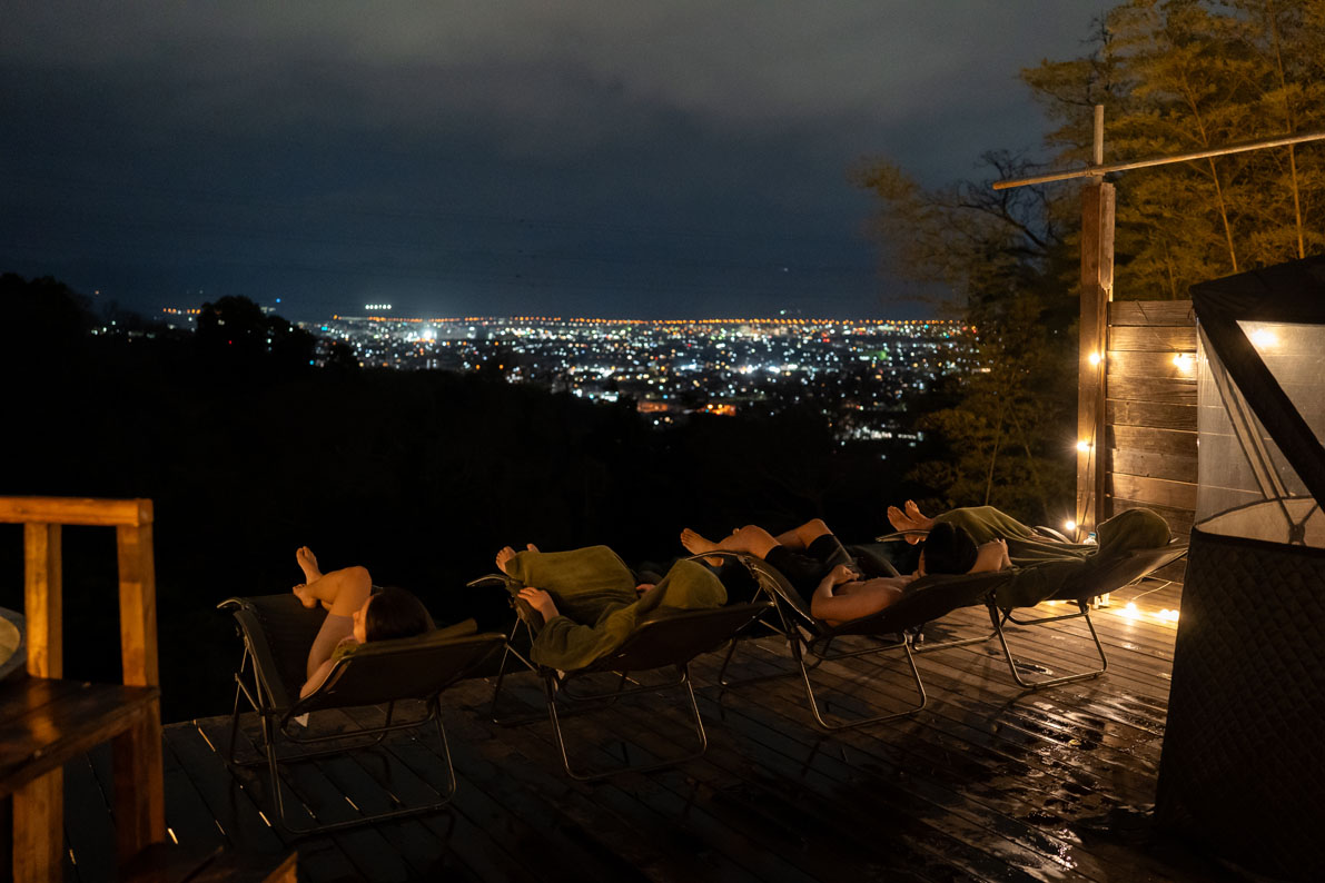水風呂から出たら大自然を目の前にパノラマ外気浴を。風や木々のせせらぎ、鳥の声を聞きながら “天空のととのいタイム”。自然に溶け込んでいくような不思議な感覚で、贅沢な時間を過ごせます。