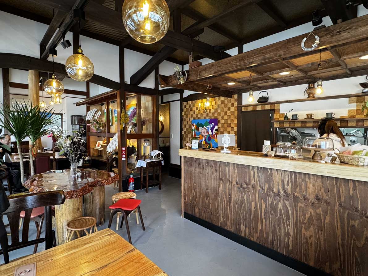 その畑宿にある寄木細工のお土産屋だった建物をリノベーション。寄木細工をあしらった内装や、オーナーがセレクトしたアンティーク小物や雑貨が並ぶ、温もりあるカフェへ新しく生まれ変わりました。