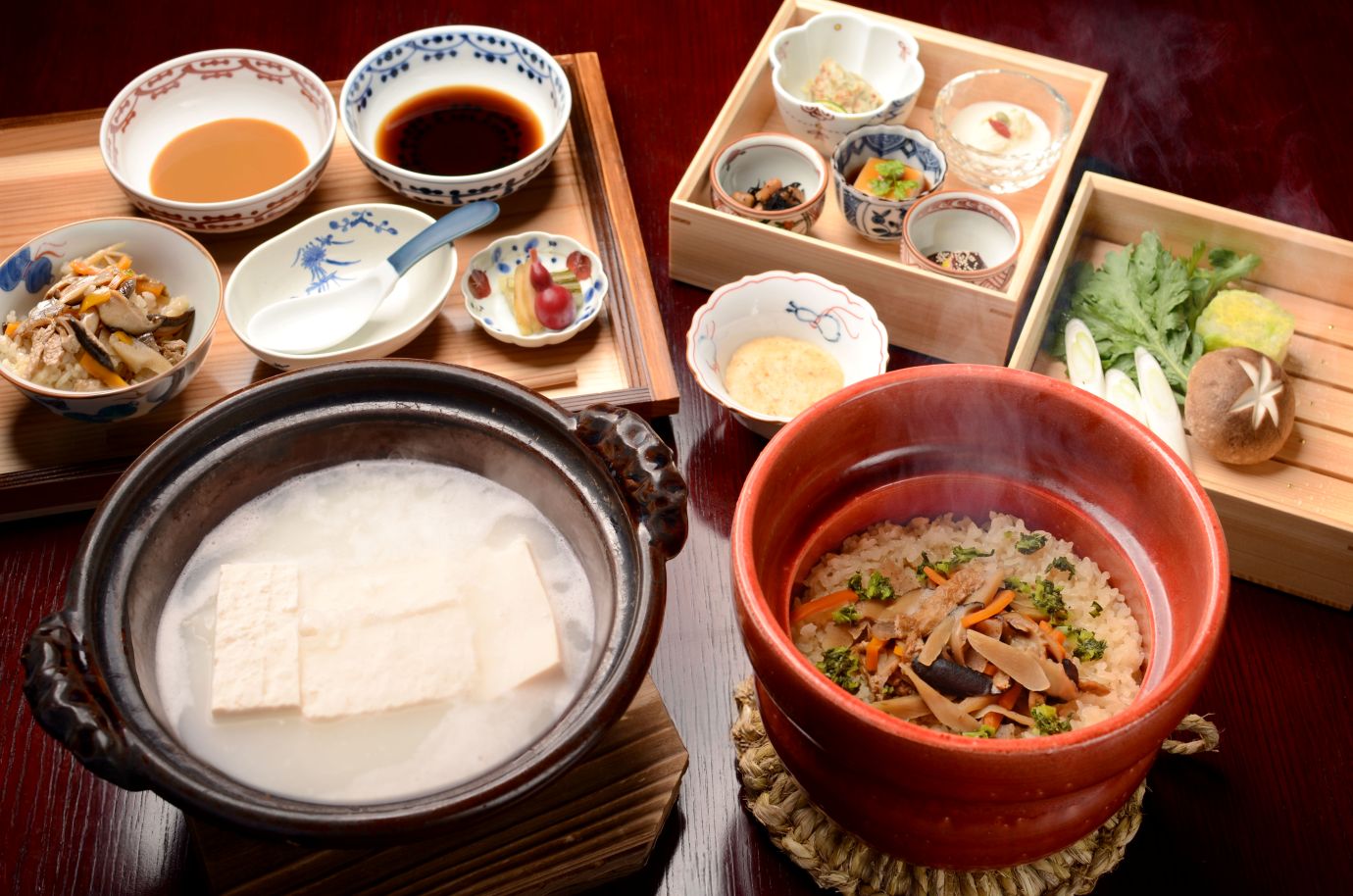温泉調理水で煮ることによりとろけだし、クリーミーな味わいに仕上げる「温泉湯豆腐」は、地元の名店「湯河原 十二庵」の豆腐を「完全天日塩」・「ゆずぽん酢醤油」・「胡麻だれ」・「黒八味唐辛子」で。季節の素材を生かし、御殿場産コシヒカリを土釜で炊き立てを提供する「箱根峠の釜めし」は素材の旨味を引き出した逸品です。中庭の日本庭園とともにゆったりとお食事が楽しめます。