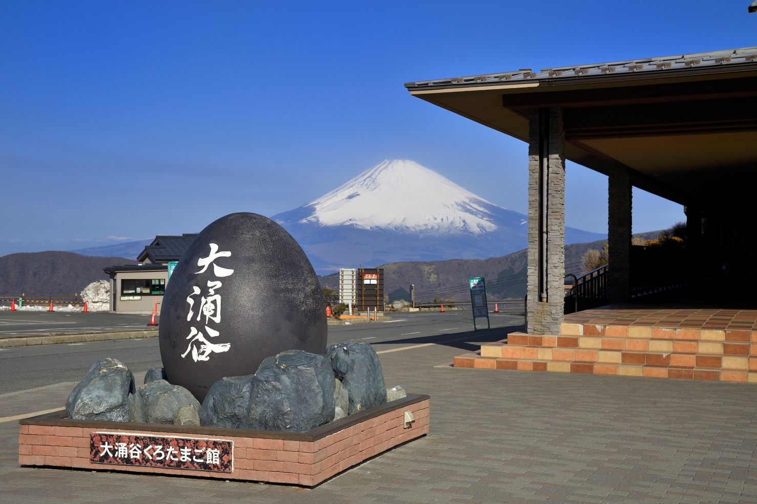 すすき草原と併せて行きたい景勝地の大涌谷。大涌谷は、およそ3000年前の噴火によりできた崩壊地形。現在も活発な火山活動があり、その様子は迫力満点。晴れた日には富士山も一望でき、富士山を背景に、黒たまごのモニュメントと記念撮影ができるスポットも人気です。